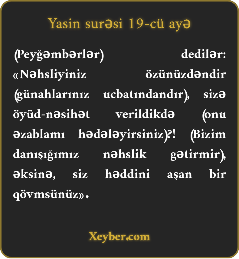 (Peyğəmbərlər) dedilər: «Nəhsliyiniz özünüzdəndir (günahlarınız ucbatındandır), sizə öyüd-nəsihət verildikdə (onu əzablamı hədələyirsiniz)?! (Bizim danışığımız nəhslik gətirmir), əksinə, siz həddini aşan bir qövmsünüz».