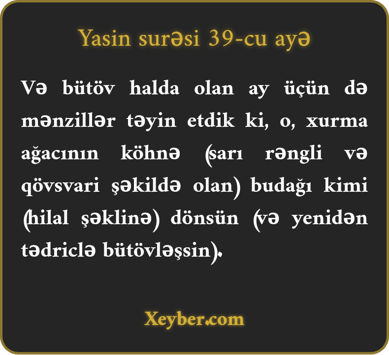 Və bütöv halda olan ay üçün də mənzillər təyin etdik ki, o, xurma ağacının köhnə (sarı rəngli və qövsvari şəkildə olan) budağı kimi (hilal şəklinə) dönsün (və yenidən tədriclə bütövləşsin).