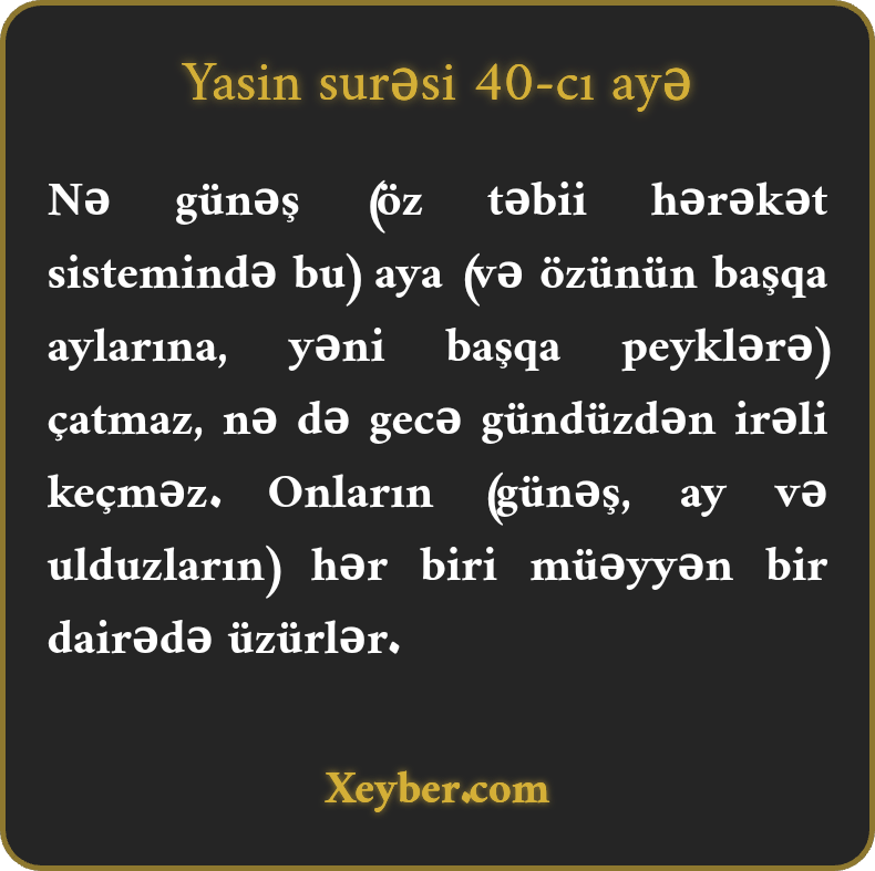 Nə günəş (öz təbii hərəkət sistemində bu) aya (və özünün başqa aylarına, yəni başqa peyklərə) çatmaz, nə də gecə gündüzdən irəli keçməz. Onların (günəş, ay və ulduzların) hər biri müəyyən bir dairədə üzürlər.