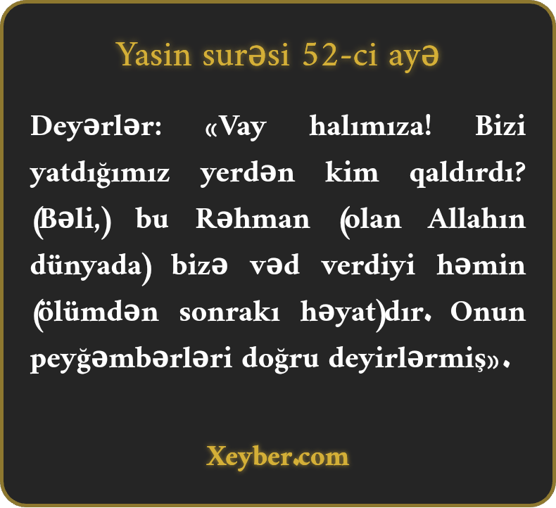 Deyərlər: «Vay halımıza! Bizi yatdığımız yerdən kim qaldırdı? (Bəli,) bu Rəhman (olan Allahın dünyada) bizə vəd verdiyi həmin (ölümdən sonrakı həyat)dır. Onun peyğəmbərləri doğru deyirlərmiş».