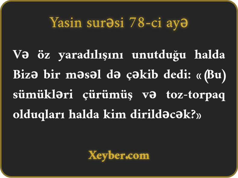Və öz yaradılışını unutduğu halda Bizə bir məsəl də çəkib dedi: «(Bu) sümükləri çürümüş və toz-torpaq olduqları halda kim dirildəcək?»