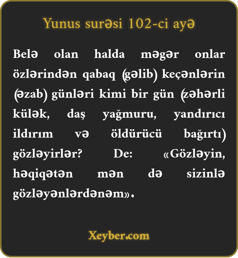 "(İlahi ayələrə və peyğəmbərlərə qarşı çıxanlar) keçmişdəkilərin (zillət dolu) ruzgarından başqa bir ruzgar intizarındamıdırlar? De ki, intizarda olun, mən də sizinlə (birlikdə) intizardayam. (Keçmişdəkilərin düçar olduğu bəlaya siz də düçar olarsınız.)”