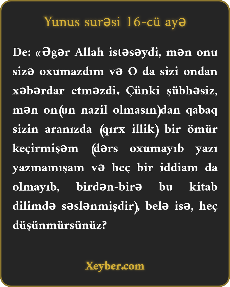 "De ki, əgər Allah istəsəydi, onu (Quranı) sizin üçün oxumaz, sizi ondan xəbərdar etməzdim. Mən Qurandan öncə aranızda bir ömür yaşamışam. Yoxsa düşünmürsünüz?!”