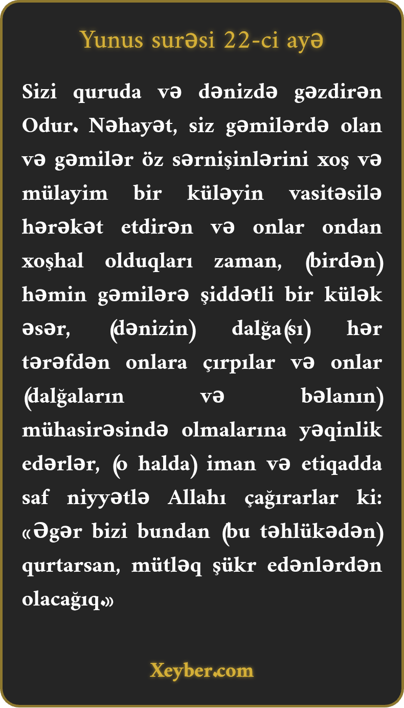 "Sizi quruda və dəryada gəzdirən Odur. Gəmidə olduğunuz, müvafiq bir küləyin gəmiləri hərəkətə gətirdiyi və (onda olanlar) bu vasitə ilə xoşhal olduğu vaxt qəfildən tufan qopanda, dalğalar hər tərəfdən sorağlarına gələndə bəla mühasirəsinə düşdüklərini güman edib Allahı xalis əqidə ilə çağırarlar (və deyərlər:) əgər bizi bu təhlükədən xilas etsən, şübhəsiz şükür edənlərdən olacağıq.”