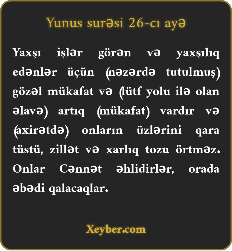 "Yaxşılıq edənlər üçün daha yaxşı və daha artıq mükafat olacaq. Onların çöhrəsinə zillət və xarlıq tozu qonmayacaq. Onlar behişt əhlidirlər və həmişə oradadırlar.”
