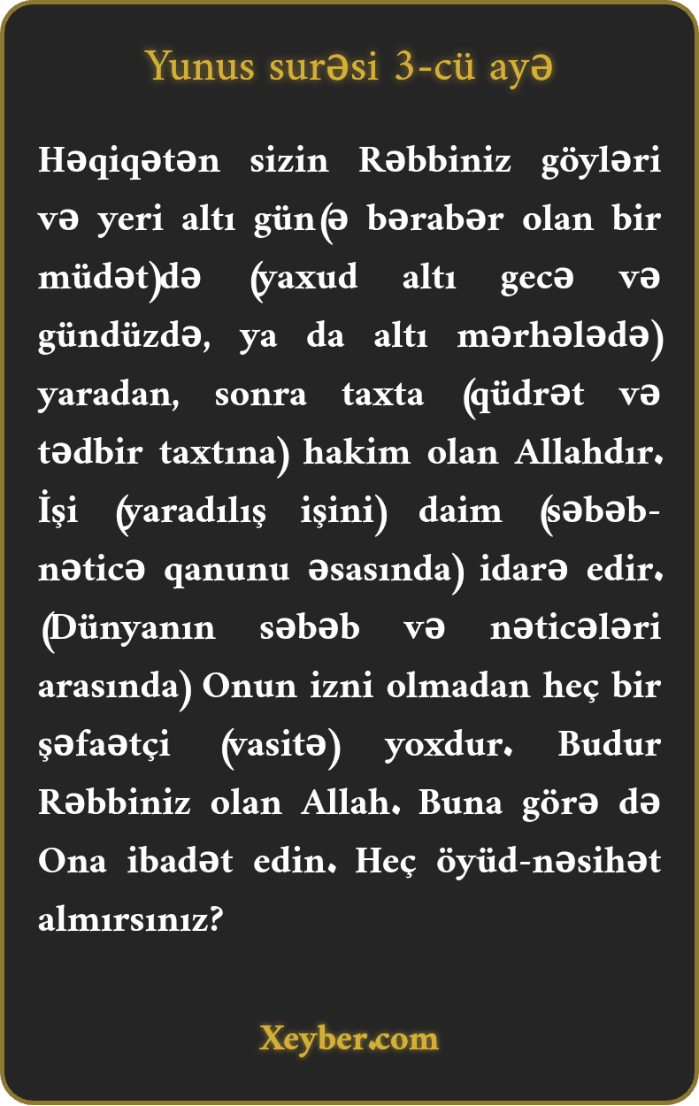 "Həqiqətən, Rəbbiniz o Allahdır ki, göyləri və yeri altı gündə, dövrdə yaratdı, sonra ərşi hökmü altına aldı. Aləmin işini idarə edir və sahmana salır. Ondan izinsiz heç bir şəfaətçi yoxdur. O, sizin Rəbbiniz olan Allahdır. Ona pərəstiş edin. Öyüd götürmürsünüzmü?”