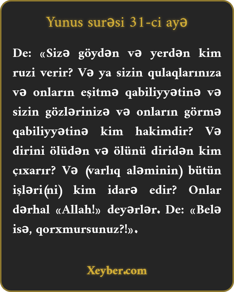 "De ki, sizə göydən və yerdən ruzi verən kimdir? Qulaq və gözlərin sahibi kimdir? Kimdir dirini ölüdən, ölünü diridən çıxaran? Kimdir varlığın işini sahmana salan? (Cavab olaraq) deyəcəklər: "Allah.” De ki, məgər Allahdan qeyrisinə pərəstişin cəzasından qorxmursunuz?”