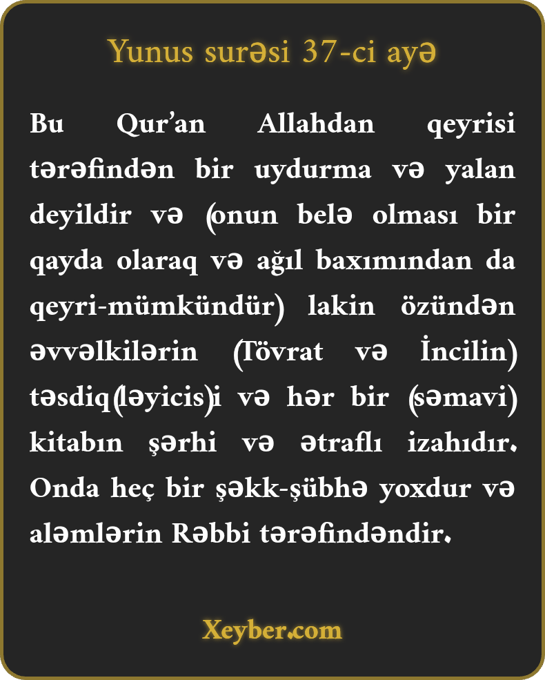 "Belə deyil ki, bu Quran Allahdan qeyrisi tərəfindən və yalan olaraq düzəldilsin. O əvvəlki səmavi kitabların təsdiqi və izahıdır. Onun aləmlərin Rəbbi tərəfindən olmasında heç bir şəkk-şübhə yoxdur.”