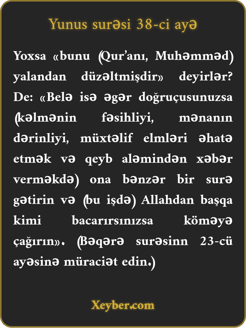 "Hətta "Quranı (özündən) toxumuşdur” deyirlər. De ki, əgər doğru deyirsinizsə, onun kimi bir surə gətirin və Allahdan qeyri bacardığınız kəsi köməyə çağırın.”