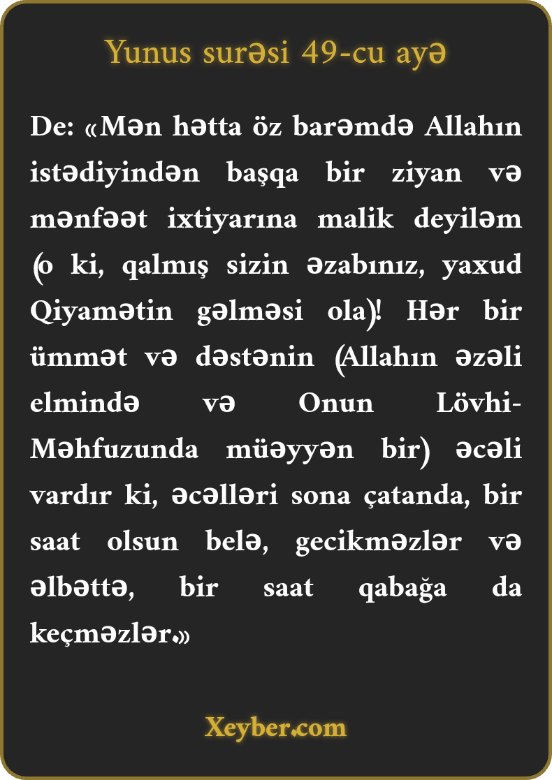 "De ki, mən (hətta) özüm üçün Allahın istədiyindən savay bir zərər və xeyirə malik deyiləm. Hər bir ümmət üçün əcəl, son müəyyənləşmişdir. Əgər bu müddət yetişsə nə bir an təxirə salınar, nə də qabağa çəkilər.”