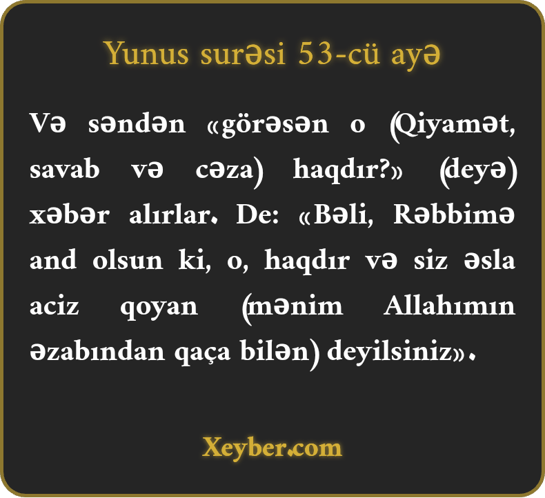 "Səndən xəbər alırlar ki, (cəza vədi) haqdırmı? De ki, bəli, and olsun Rəbbimə, o qətidir və siz (Allahı) bu işdə aciz qoya bilməzsiniz.”