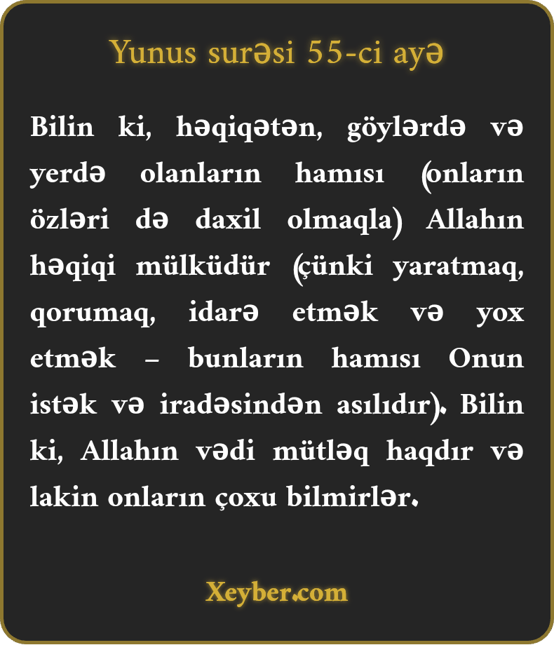 "Agah olun! Göylərdə və yerdə olan, şübhəsiz, Allahındır. Agah olun ki, Allahın vədi qəti və doğrudur. Amma onların çoxu bilmirlər.”