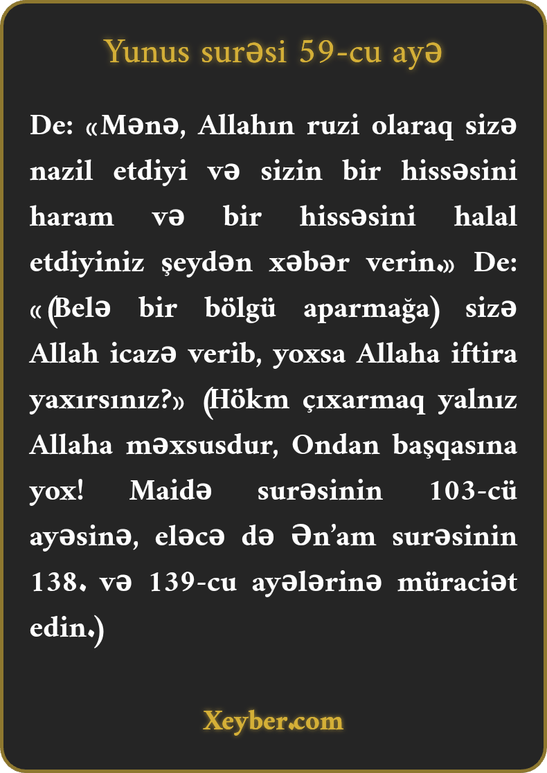 "De ki, gördünüzmü, Allah sizin üçün nə ruzi nazil etdisə, (özbaşına) bəzisini haram, bəzisini halal etdiniz? De ki, Allah sizə icazə vermişdi, yoxsa iftira qoşursunuz?”
