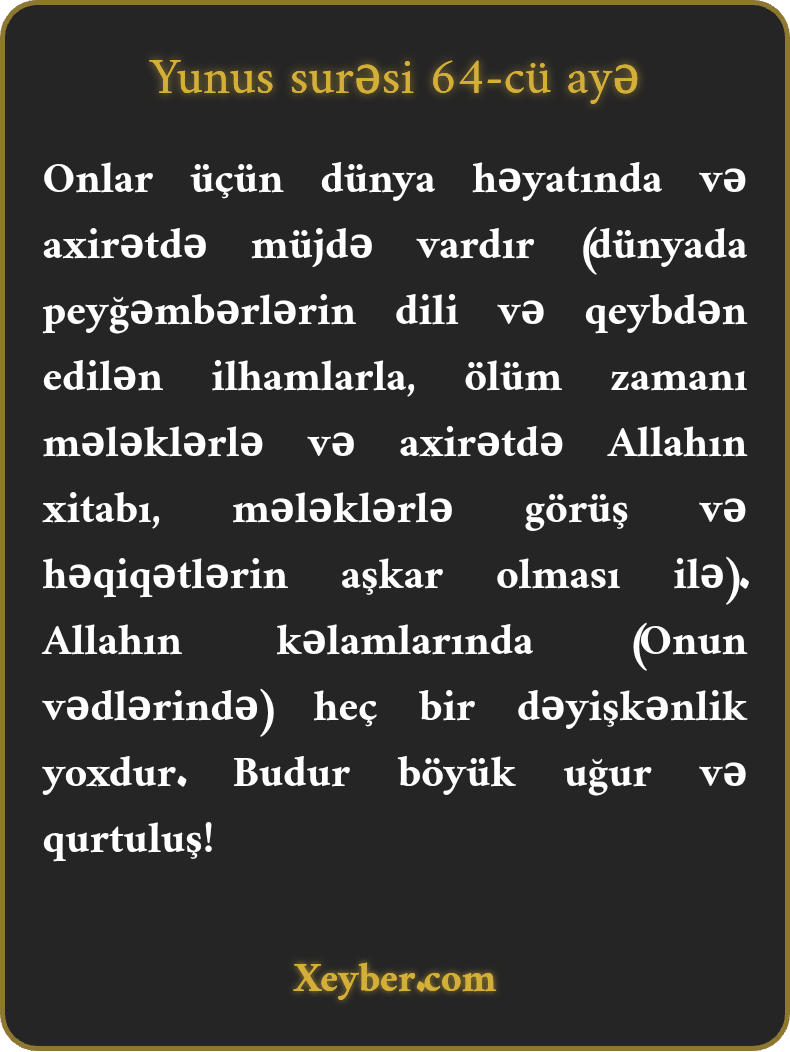 "Onlar (Allahın övliyaları) üçün dünya və axirət həyatında müjdə var. Allahın sözləri (vədləri) dəyişməzdir. O, həmin böyük qurtuluşdur.”