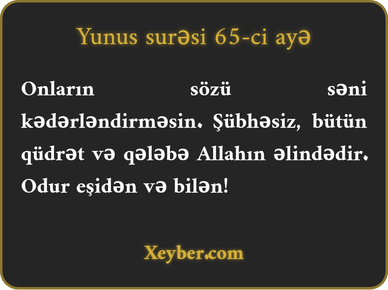 "Müxaliflərin dedikləri səni qəmləndirməsin. Çünki izzət bütünlüklə Allahındır. O, eşidən və biləndir.”
