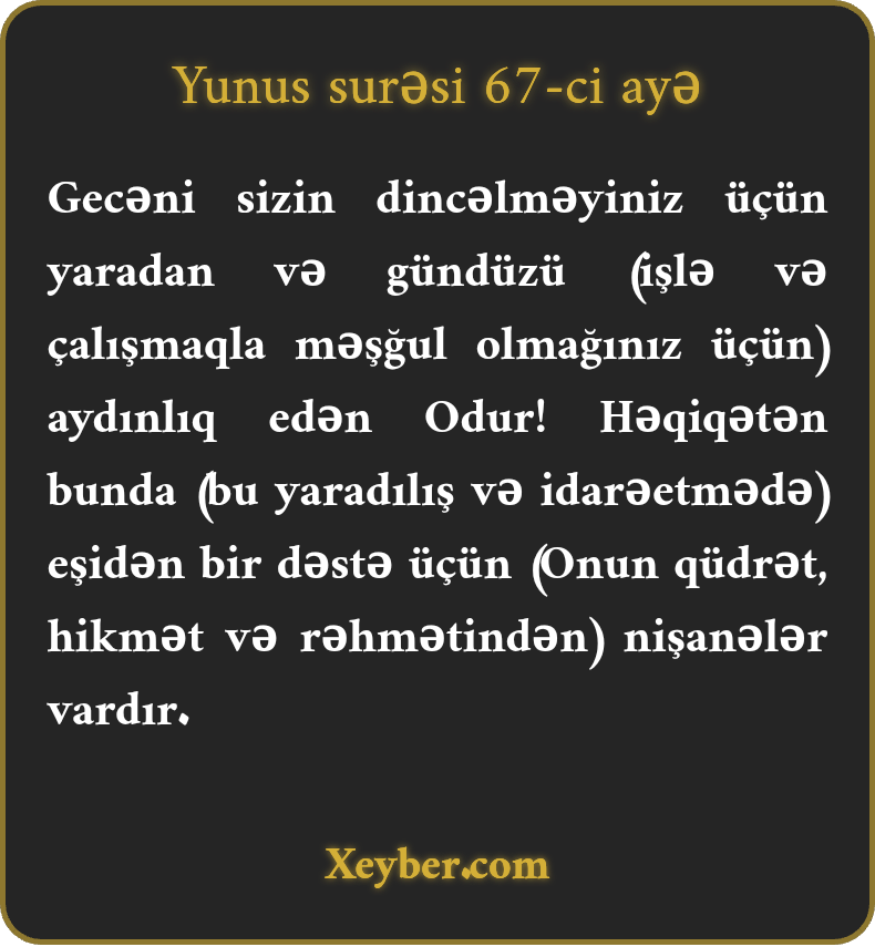"Rahatlıq tapmağınız üçün sizin üçün gecəni müəyyənləşdirən Odur. O, gündüzü işıqlı etdi. Şübhəsiz, bunda eşidən qövm üçün nişanələr var.”