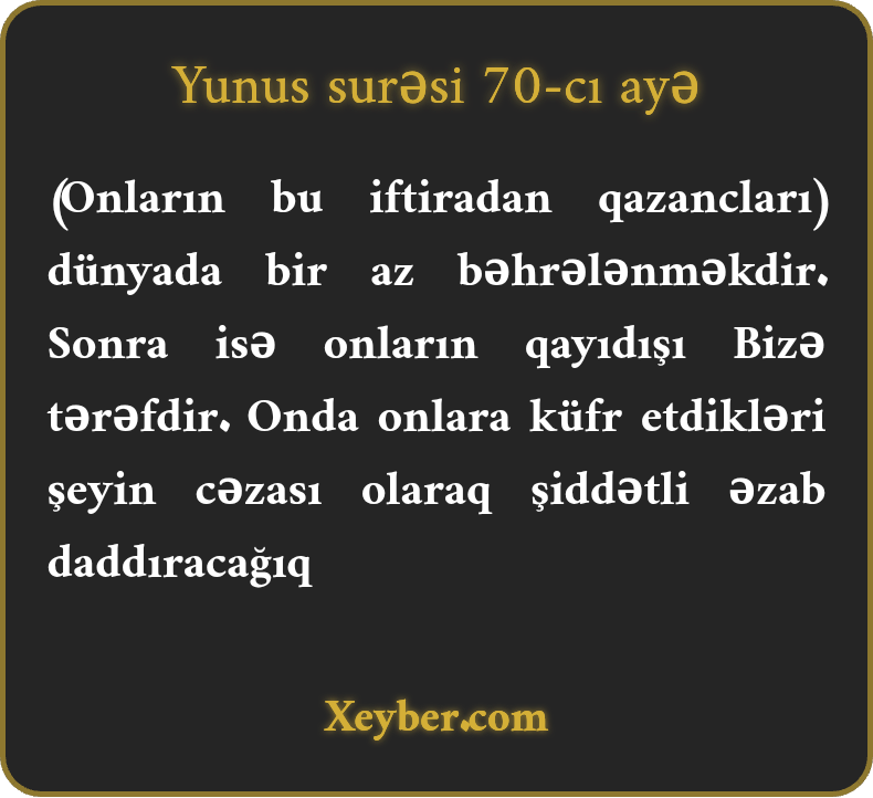 "Onların dünyada bəhrələri azdır. Sonra Bizə doğru qayıdarlar. Həmin vaxt küfrlərinin cəzası olaraq onlara ağır əzabı daddırarıq.”
