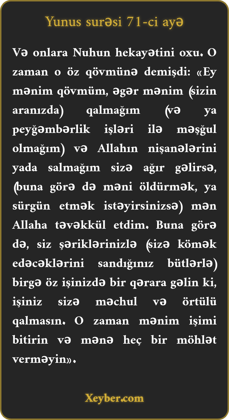 "Onlara Nuhun əhvalatını oxu. O öz qövmünə dedi: "Ey mənim qövmüm! Əgər mənim qalmağım, (aranızdakı mövqeyim), Allahın ayələrini xatırlatmağım sizə ağır və dözülməz gəlirsə, (bilin ki,) mən yalnız Allaha təvəkkül etmişəm. Siz və şərikləriniz fikrinizi cəmləyin ki, işinizdən sizə qaranlıq qalmasın. Sonra mənim haqqımda qərar çıxarın və mənə möhlət verməyin.”