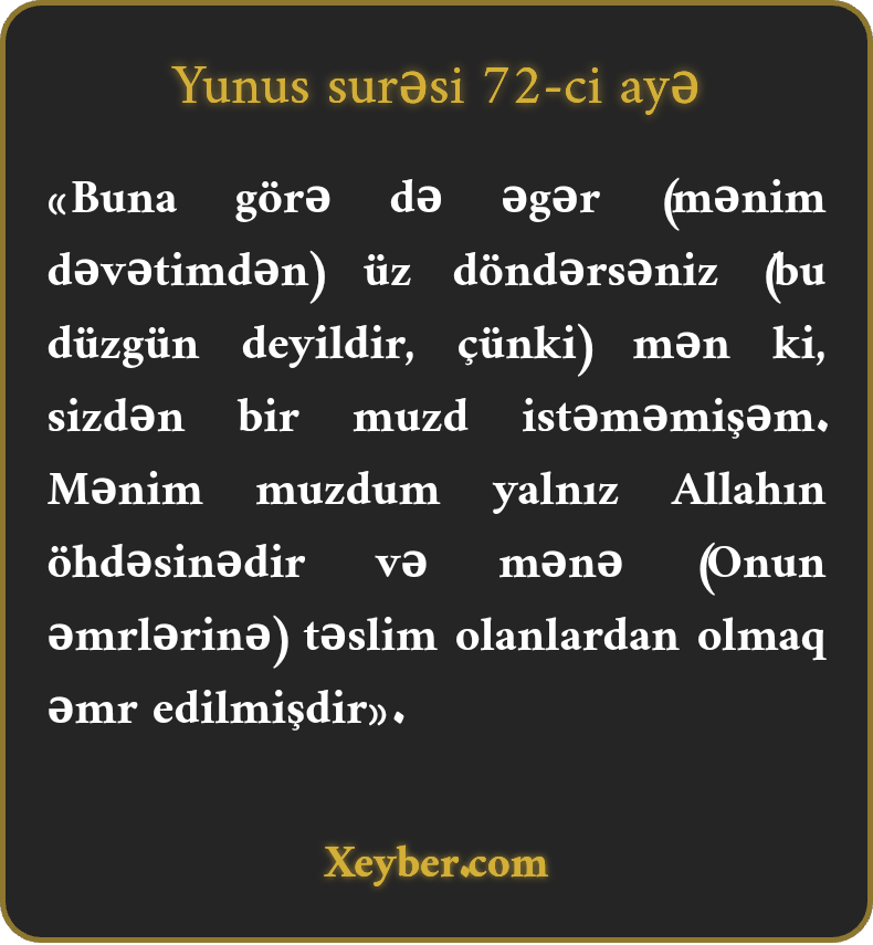 "Əgər (Allahın dəvətinə) arxa çevirsəniz, (bilin ki,) mən sizdən muzd istəməmişəm. Mənim mükafatımı yalnız Allah verər və mən Onun əmrinə təslim olmaq əmri almışam.”