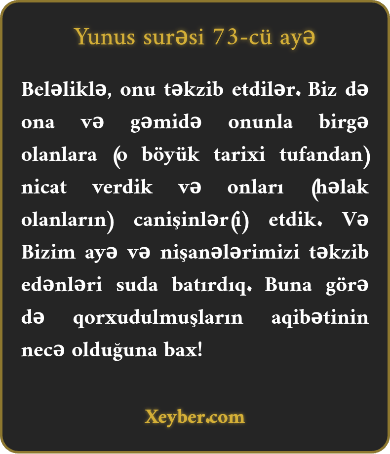"Onu (Nuhu) təkzib etdilər. Həmin vaxt Biz ona və onunla birlikdə gəmidə olanlara nicat verdik, onları yer üzündə canişin qərar verdik. Ayələrimizi təkzib edənlərin hamısını qərq etdik. Bax gör, xəbərdarlıq edilənlərin sonu necə oldu?”