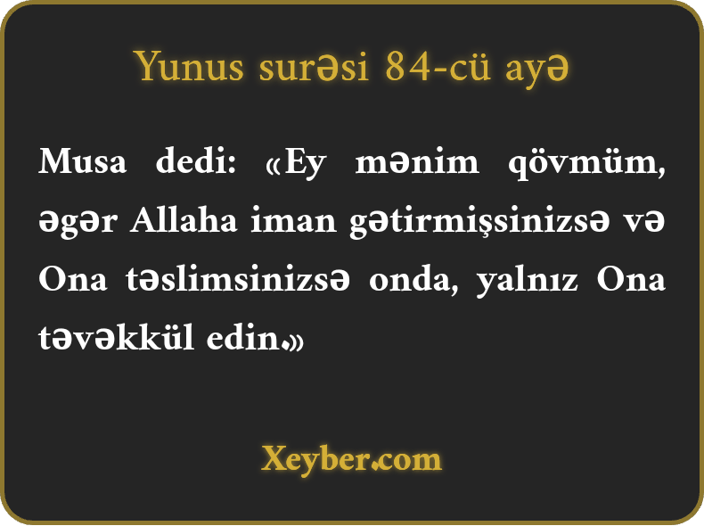 "Musa dedi: "Ey mənim qövmüm! Əgər Allaha iman gətirib Ona təslim olmusunuzsa, yalnız Ona təvəkkül edin.”