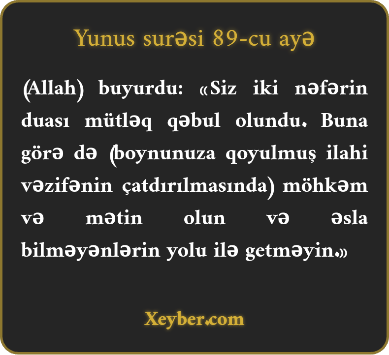 "(Allah-təala) buyurdu: "Siz iki nəfərin duası qəbul oldu. Möhkəm dayanın və nadanların yolu ilə getməyin.”