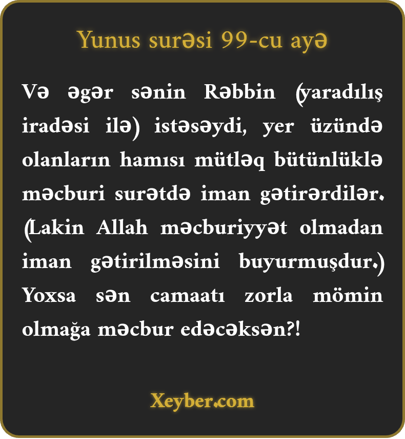 "Əgər Rəbbin istəsəydi, yer üzünün bütün əhli (məcburi şəkildə) birdəfəyə iman gətirərdi. (Amma qanun budur ki, azad şəkildə iman gətirilsin.) Sən xalqı iman gətirməyə məcburmu edirsən?!”