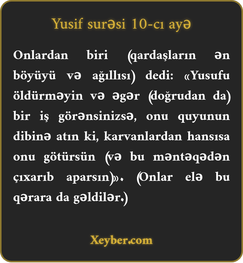 "Onların arasından dillənən biri dedi: "Yusifi öldürməyin, onu quyunun dibinə atın ki, karvanlardan biri onu götürsün.”