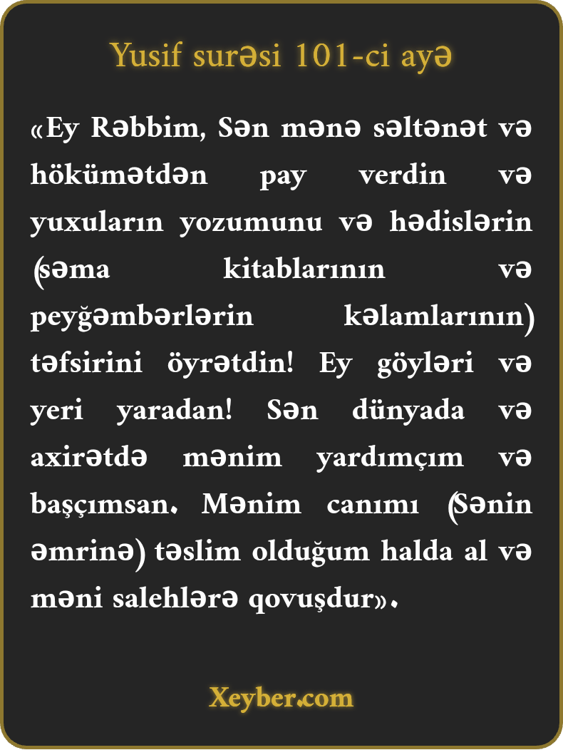 "(Yusuf dedi:) Pərvərdigara, Sən mənə hökumətdən (bəhrə) verdin, yuxuların təbirini öyrətdin. Ey göyləri və yeri yaradan, dünya və axirətdə mənim mövlam yalnız Sənsən. Məni müsəlman olaraq dünyadan apar və salehlərə qovuşdur.”