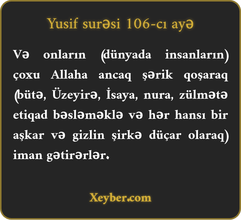 "Onların çoxu Allaha şərik qoşmadan iman gətirməz (imanları xalis deyil).”