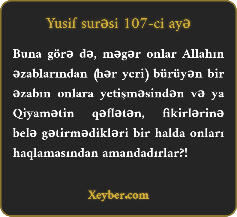 "Görən (iman gətirməyənlər) ilahi əzabın onları bürüyəcəyindən və ya Qiyamətin qəfildən bərpa olacağından amandadırlarmı?”