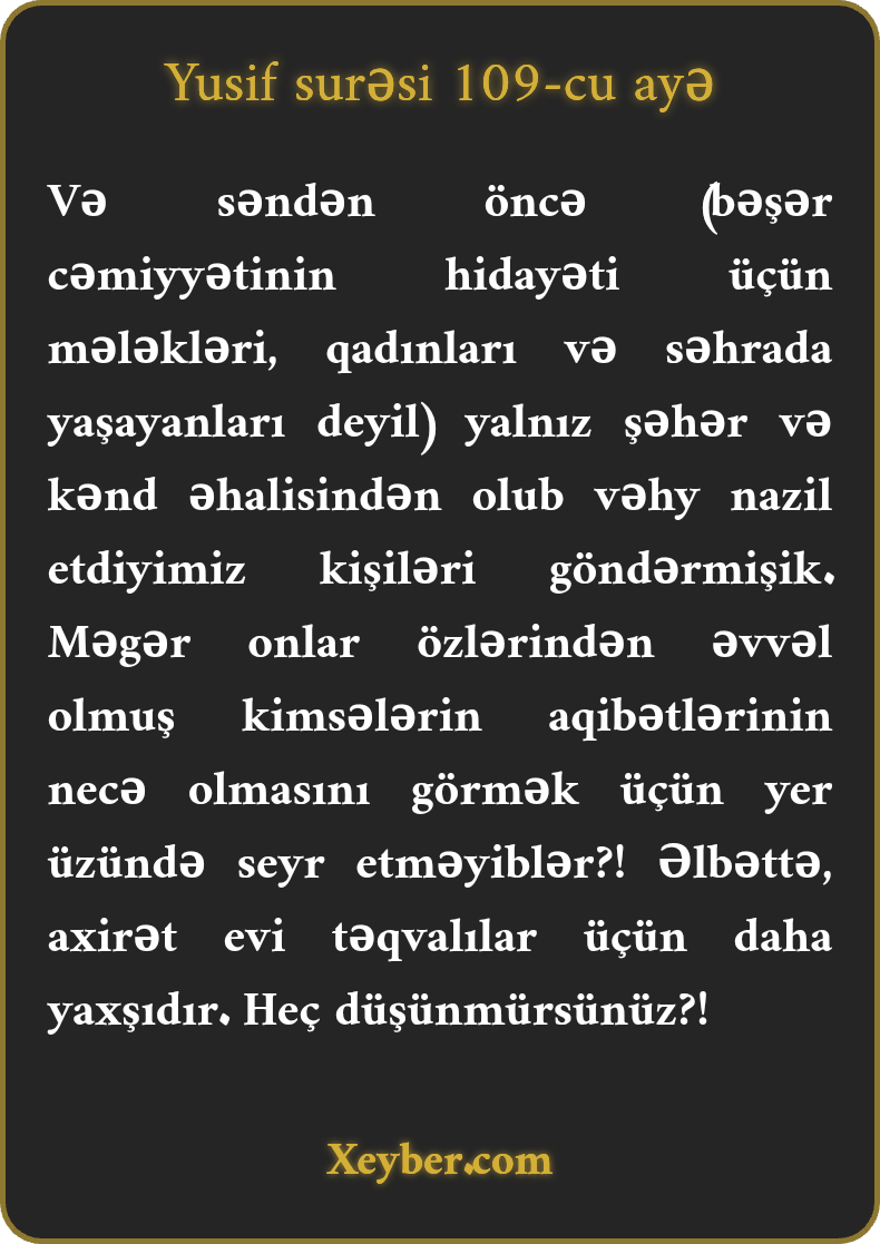 "Səndən öncə abadlıq əhlindən olan, özlərinə də vəhy etdiyimiz kişilər göndərdik. Özlərindən əvvəlkilərin aqibətini görmək üçün yer üzünü gəzmədilərmi? Şübhəsiz, təqva yolunu seçənlər üçün axirət evi daha üstündür. Yoxsa düşünmürsünüz?”