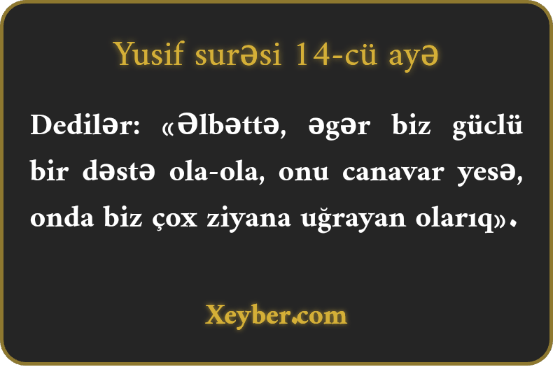 "(Yəqubun övladları) dedilər: "Biz güclü bir dəstə olduğumuz halda canavar onu yesə, ziyankar olarıq ki!”