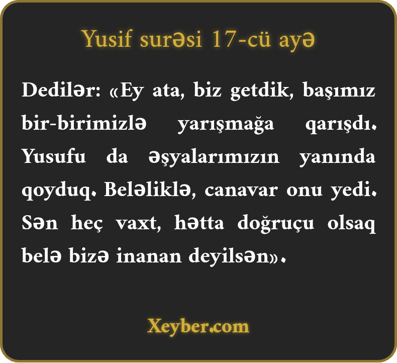 "Dedilər: Ey ata! Biz yarışmaq üçün getdik, Yusifi şeylərimizin yanında qoyduq. Sonra canavar onu yedi. Əlbəttə, biz doğru danışsaq da sözlərimizə inanmırsan.”