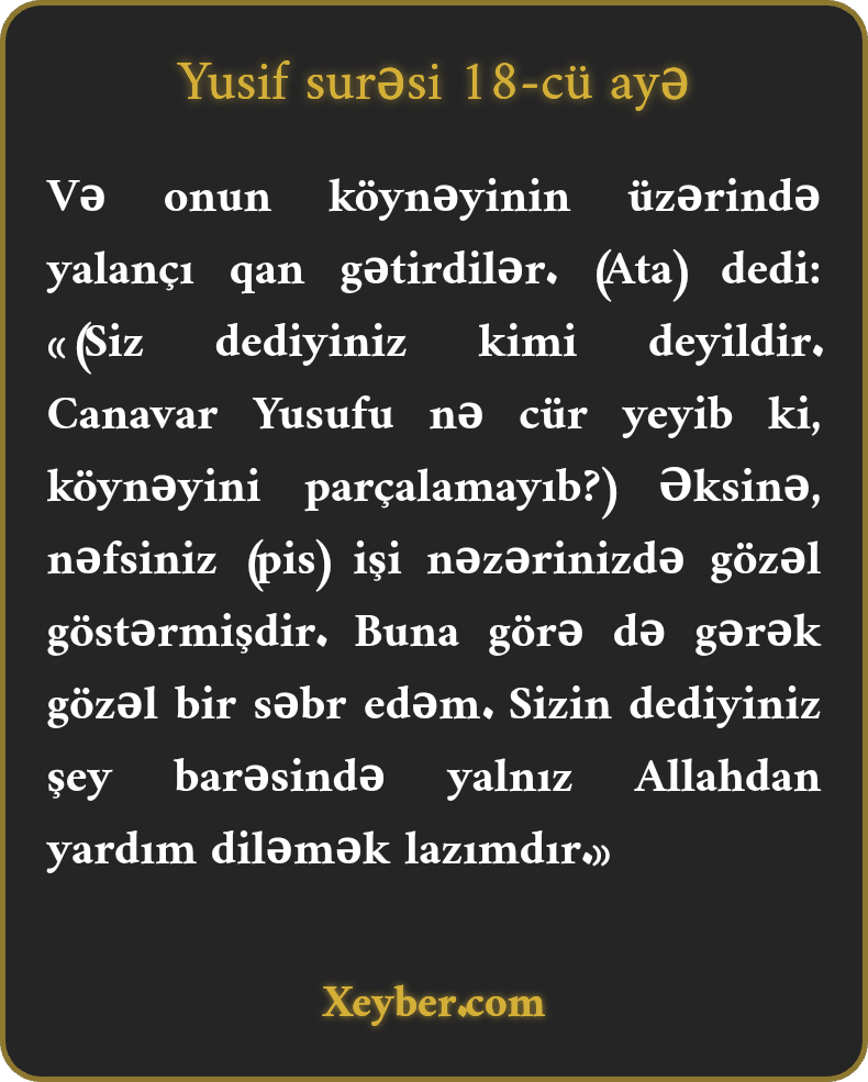 "Yusifin köynəyini yalandan qana batırıb (atalarının yanına) gətirdilər. (Ata) dedi: "Belə deyil, nəfsiniz sizə pis işi bəzəmişdir. Gözəl və yaxşı səbir lazımdır. Dediklərinizlə bağlı Allahın yardımını istəyirəm.”