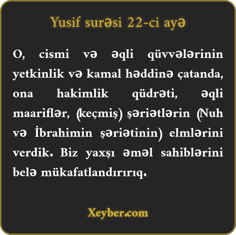 "(Yusif) yetkinlik qüvvəsinə çatdığı vaxt ona hökm və elm verdik. Biz yaxşı əməl sahiblərini bu sayaq mükafatlandırırıq.”
