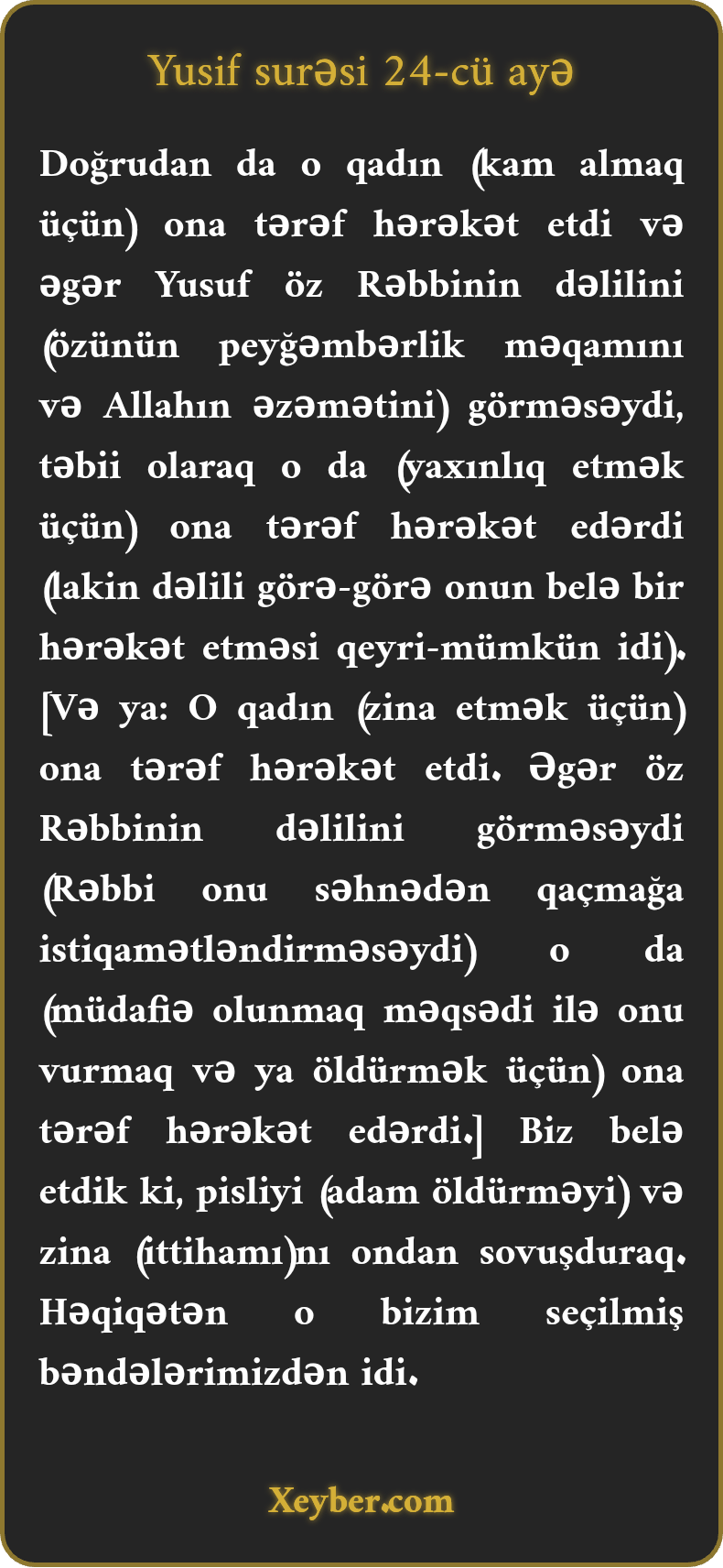 "Həqiqətən, (Əzizi-Misrin arvadı) ona (Yusufa) meyl etdi. Əgər Allahın dəlilini görməsəydi, o da meyl edərdi. Bu sayaq (dəlillərlə ona kömək etdik ki,) pisliyi ondan uzaqlaşdıraq. Çünki o Bizim xalis bəndələrimizdəndir.”