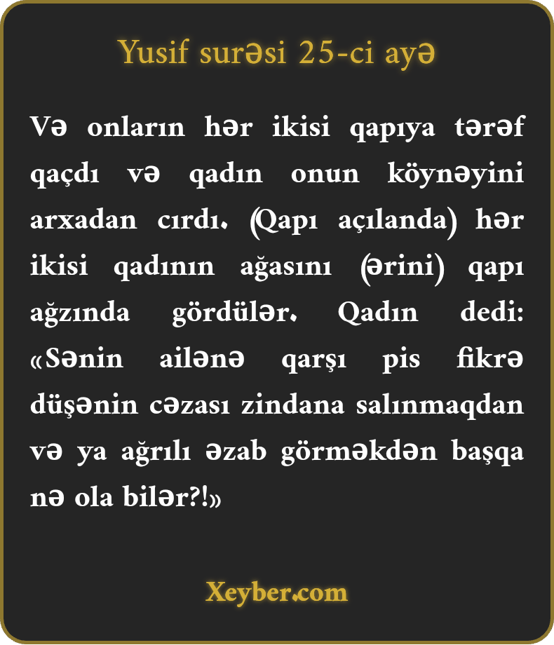 "Hər ikisi qapıya doğru çıxdı. Qadın onun köynəyini arxadan cırdı. Qəfildən ərini yanında gördü. Qadın (intiqam və ya bəraət üçün) dedi: "Zövcənə qarşı pis məqsədi olanın yeri zindan və ya ağrılı işkəncədən başqa nədir?”