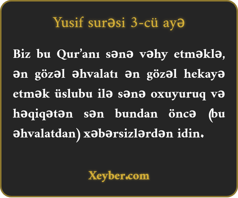 "Biz sənə vəhy etdiyimiz bu Quranla sənin üçün ən üstün əhvalatı danışırıq. Halbuki sən bundan öncə xəbərsizlərdən idin.”