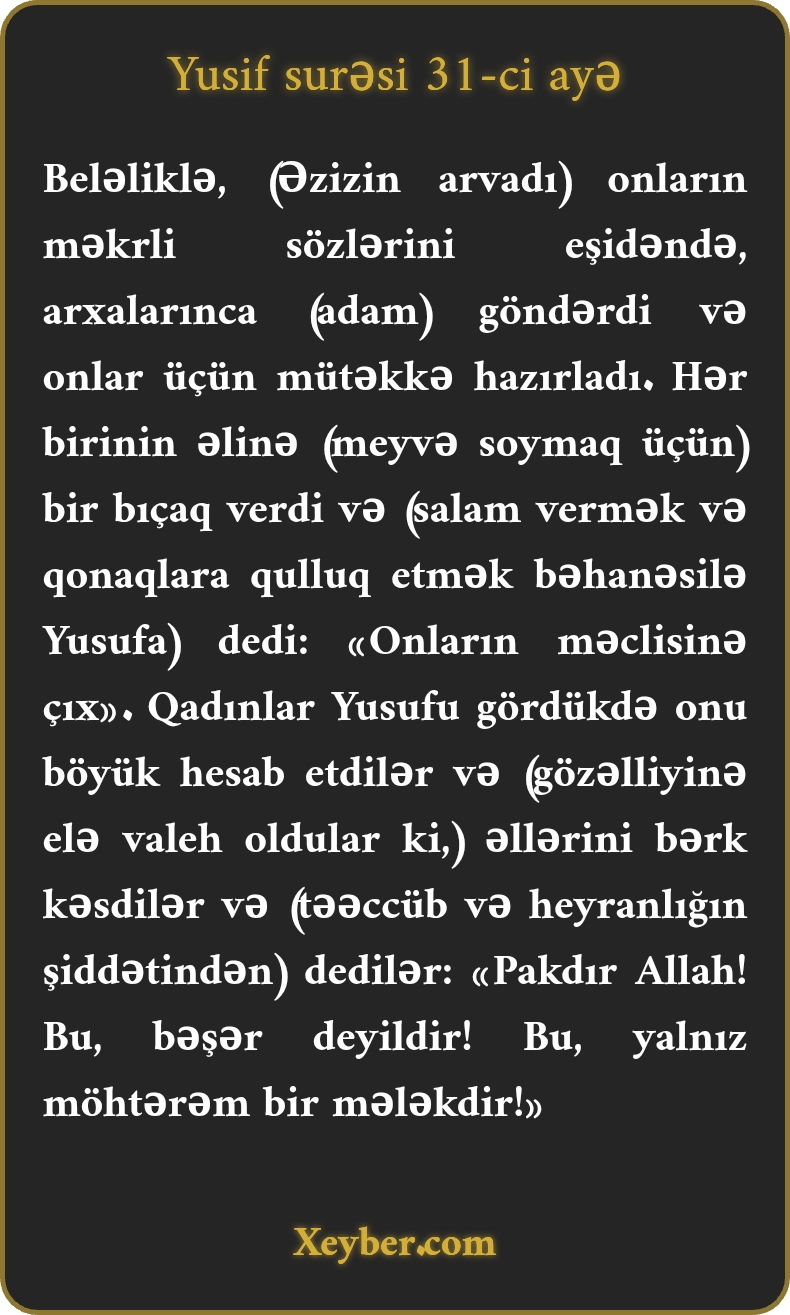 "(Əzizin zövcəsi) (misirdəki) qadınların hiyləsini (pis sözünü) eşitdi və onların ardınca adam göndərdi. Onlar üçün məclis qurdu və (meyvə üçün) hərəsinə bir bıçaq verdi. Yusifə dedi ki, qadınların yanına gəlsin. Qadınlar onu əzəmətli görüb əllərini kəsdilər və dedilər: "Aman Allah, bu, bəşər deyil, əziz bir mələkdir.”