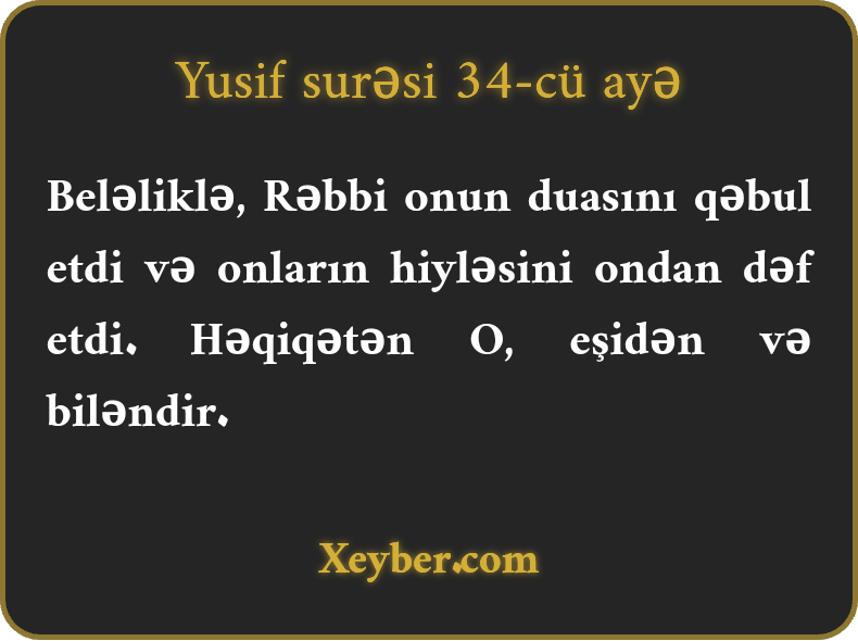 "Belə ki, Rəbbi onu (duasını) qəbul etdi və qadınların hiyləsini ondan pak etdi. Çünki O (Allah) eşidən və biləndir.”