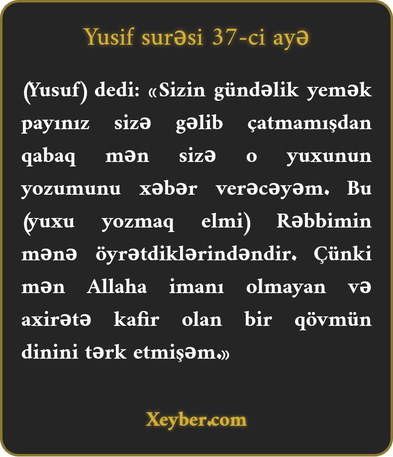 "(Yusif yuxu görmüş həmin iki şəxsə) dedi: "Yemək payınız gəlməmişdən öncə yuxunuzun təbirini deyəcəyəm. Bu, Rəbbimin mənə öyrətdiyi işlərdəndir. Həqiqətən, mən Allaha imanı olmayan, qiyaməti inkar edən qövmün ayinini boşlamışam.”