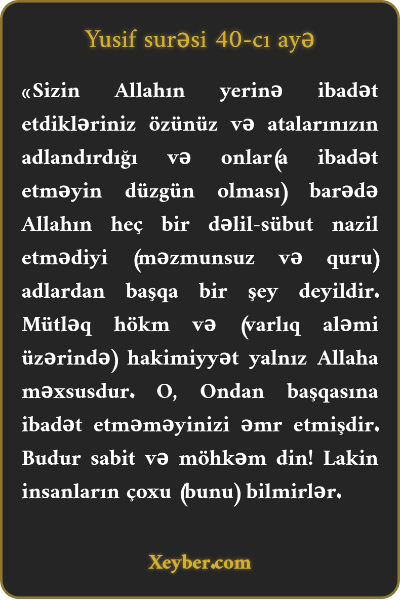 "Sizin Allahdan başqa ibadət etdikləriniz yalnız sizin və atalarınızın (heç bir əsas olmadan) qoyduğu adlardan başqa bir şey deyil. Allah (onların haqlılığını sübut edən) heç bir dəlil göndərməyib. Allahdan savay kimsənin hökm vermək haqqı yoxdur. O əmr edib ki, Ondan başqasına pərəstiş etməyəsiniz. Bu din möhkəm dayanmışdır. Amma xalqın çoxu bilmir.”