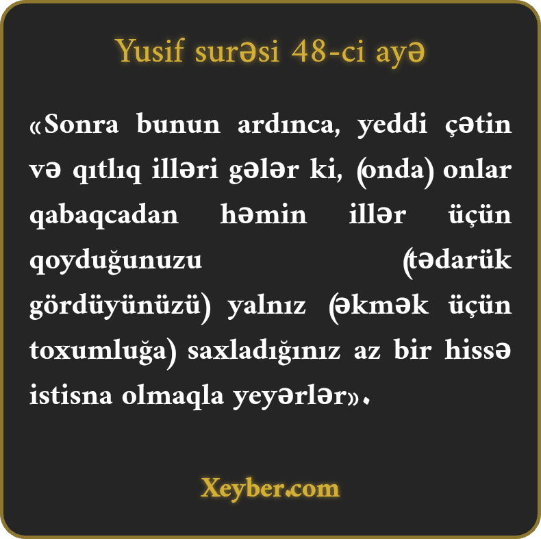 "Sonra onun ardınca yeddi il çətin gələr, xalq onlar üçün öncədən yığdığınızı yeyər, yalnız cüzi bir miqdar saxlayarsınız.”