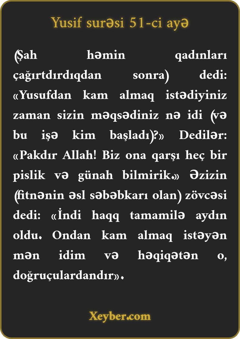 "(Padşah qadınlara) dedi: "Yusifdən kam almaq istədiyiniz vaxt məqsədiniz nə idi?” Qadınlar dedilər: "Aman Allah, biz onun heç bir pisliyini bilmirik.” Əzizin zövcəsi dedi: "İndi həqiqət aşkarlandı. Mən ondan kam almaq istədim və şəksiz, o doğru danışanlardandır.”