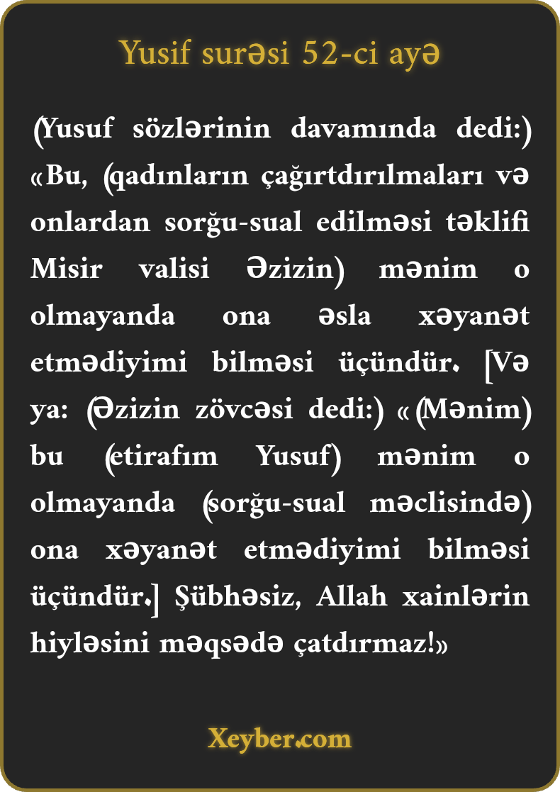 "(Yusif dedi:) Bu (qadınların etirafı) onun üçün idi ki, (Əziz) mənim gizlində ona xəyanət etmədiyimi bilsin. Şübhəsiz, Allah xainlərin hiyləsinə yol verməz.”