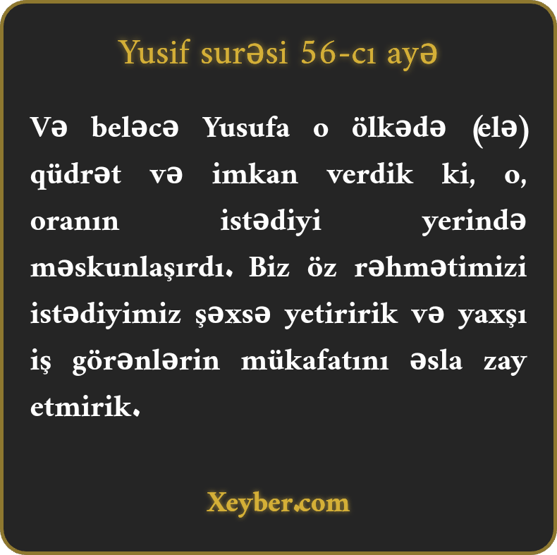 "Biz bu sayaq Yusifə o torpaqlarda qüdrət verdik ki, orada istədiyi yerdə olsun. Biz öz rəhmətimizi istədiyimiz kəsə çatdırarıq və yaxşı əməl sahiblərinin mükafatını zay etmərik.”