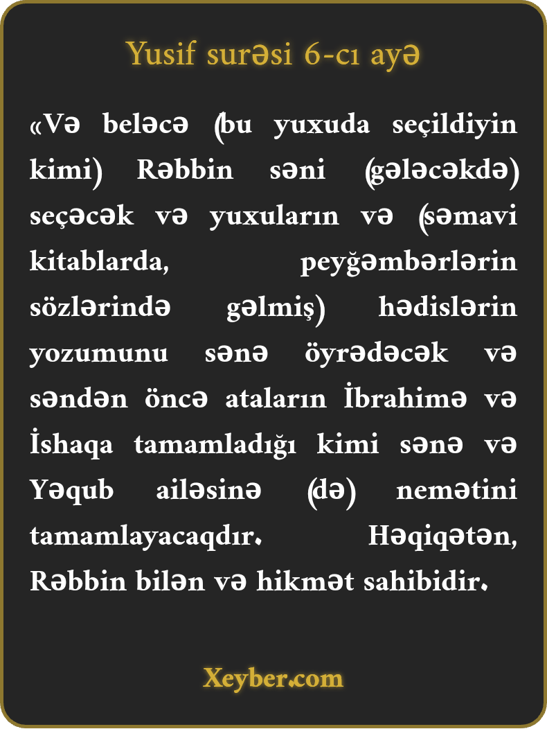 "Bu sayaq Rəbbin səni seçər, yuxularının təbirindən xəbərdar edər və sənə və Yəqub ailəsindən olanlara nemətini tamamlayar. Necə ki, bundan öncə atan İbrahim və İshaq üçün tamamladı. Həqiqətən, Rəbbin biləndir və hikmət sahibidir.”