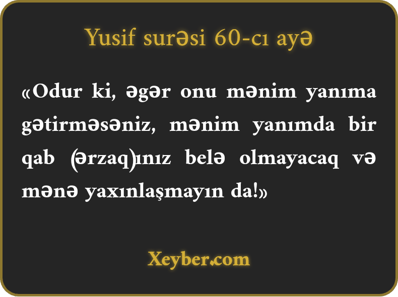 "Əgər həmin qardaşınızı mənim yanıma gətirməsəniz, məndən heç bir peymanə (taxıl) almazsınız və mənə yaxınlaşmayın.”