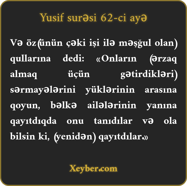 "(Yusif) öz qulamlarına dedi: "Onların ödədiklərini yüklərinin içinə qoyun. Ailələrinə qayıtdıqda onu görsünlər. Bu ümidlə ki, (növbəti dəfə) geri qayıdalar.”